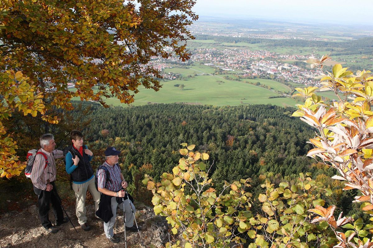 Die Ouvertüre liefert die junge Schlichem, bis zu deren Quelle ist es nicht weit. Durch einen großen Hahn sprudelt das Wasser dort aus dem Berg. Ein kühlender Zwischenstopp an heißen Sommertagen. Knackig steigt der Weg von hier unter alten Buchen und Tannen bergan. Oben belohnt die Hochfläche die „Kraxler“ mit einer grandiosen Aussicht von den Alpen bis zum Schwarzwald. Dann folgt die beeindruckende Albtrauf-Kante, wo die Hochfläche fast senkrecht abfällt. Das „Hörnle“ krönt diese Passage. Wie ein Schiffsbug schiebt sich der Fels über das Land darunter. Auch der Osttrauf liefert Panorama-Stationen und das Naturschutzgebiet „Hülenbuch“ erfreut mit blühenden Wiesen. Durch unberührten Bannwald geht es zum Start zurück.