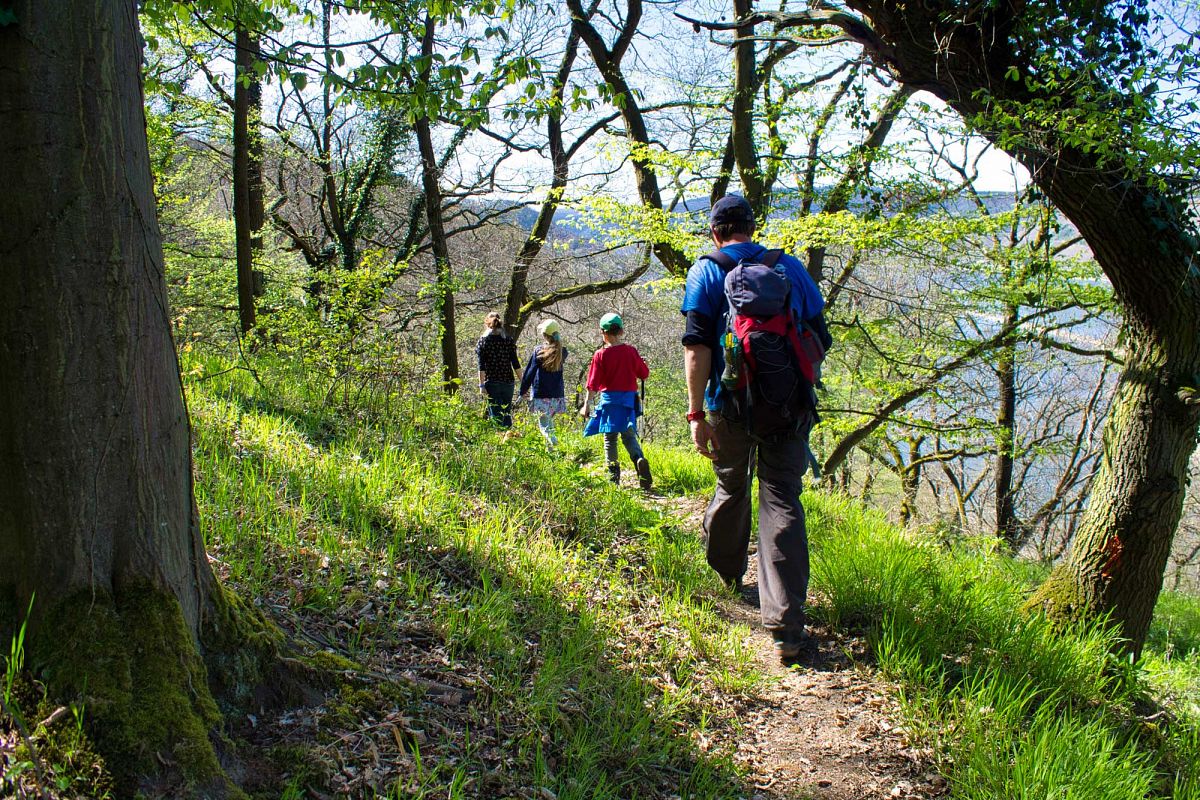 Nach der Bergab-Passage bietet sich am Wasenbachparkplatz die nächste Rastmöglichkeit. Der Langhalsweg folgt dem Rheinsteig ein Stück zurück Richtung Osterspai und führt vorbei am ehemaligen großen Steinbruch wieder bis zum Heiligenbach. Man verlässt den Rheinsteig in die Senke des Baches und passiert zwei ehemalige Stollen aus der Bergbauvergangenheit des 19. Jahrhunderts. Von hier aus führt der schönste Pfad des Weges zunächst kurz bergauf, dann am Dachsbau und entlang der Bergkante direkt oberhalb des Rheins an zwei weiteren traumhaften Aussichtspunkten vorbei. Angekommen am Panoramapunkt Mittelrheinherz lohnt es sich die Kamera oder das Handy zu zücken, für das perfekte Foto mit Blick auf Osterspai und das Mittelrheintal. Die Rheinschaukel lädt zum Verweilen ein, bevor es später in kurzen Serpentinen durch die ehemaligen Obstanbauhänge mit Schiefermauern geht. Im Hinnerschtbachtal, fast am Tunnel zur B42 angekommen, geht es auf der anderen Bachseite schon wieder bergauf. Hier folgt mit dem Pilgerweg die letzte und zugleich längste Bergpassage.