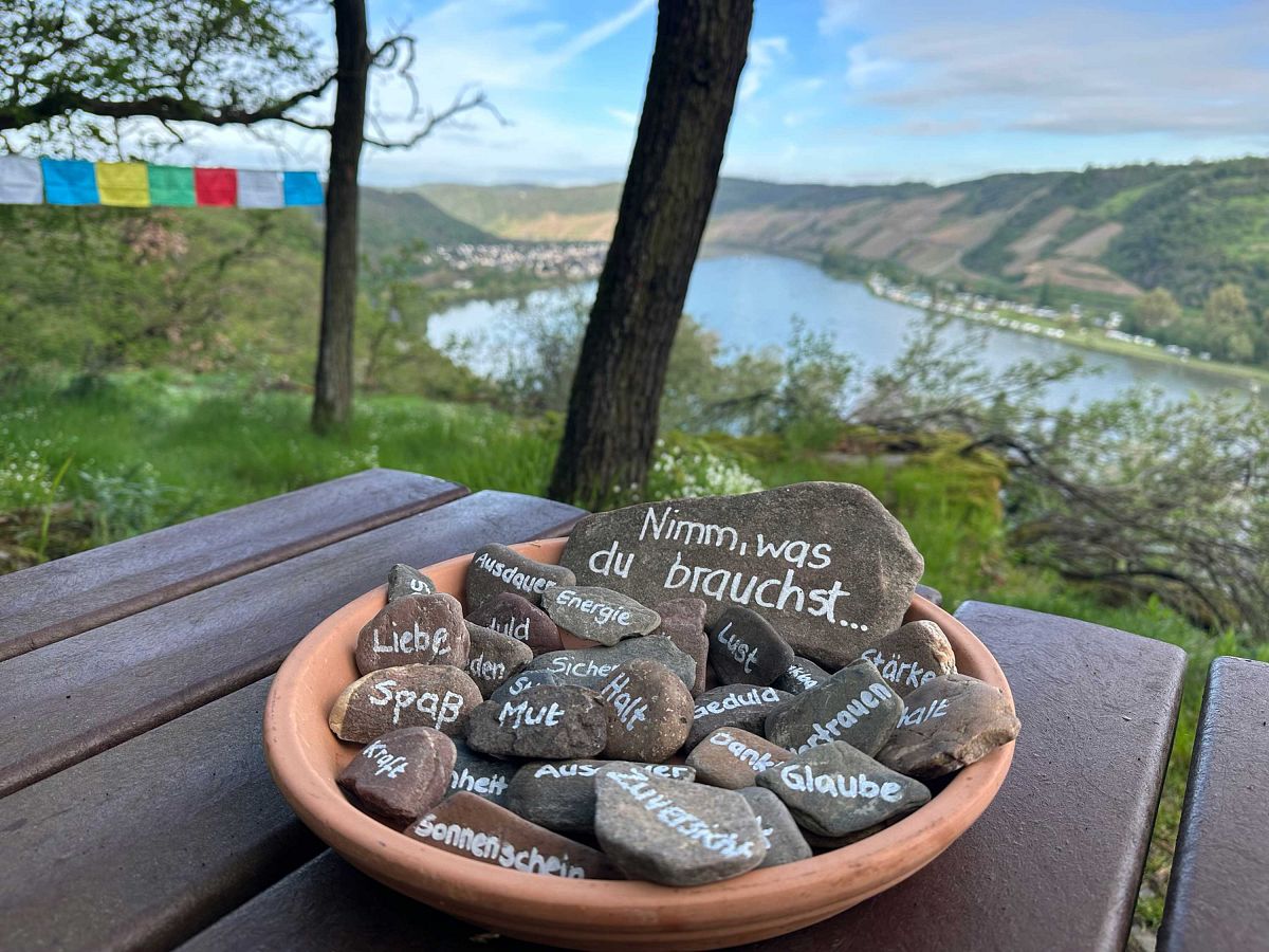 Den schmalen Pfad jetzt bergab weiter, erreicht man von oben die Florianshütte. Neben einer überdachten Rastmöglichkeit bietet sich hier der erste Ausblick auf Osterspai und das enge Türchen. Nur wenige Meter den asphaltierten Ellig herunter, biegt der Langhalsweg entlang des Forsthauses scharf rechts ab. Über eine große Weide gelangt man nun zur kleinen Kapelle am Pilgerweg. Hier bietet sich eine idyllische Rastmöglichkeit in traumhafter Natur bei seltenen Orchideenpflanzen. Von dort geht es zunächst durch einen kleinen Pfad über die Hinnerscht Bach und anschließend eine längere Passage des breiten Rheinsteigs über den Landsberg bis zum nächsten Osterspaier Nebenfluss des Rheins, dem Heiligenbach. Der Langhalsweg folgt dem Bachtal ein Stück Richtung Rhein, dann geht es ein weiteres Mal steil bergauf, bis zu einem weiteren Höhenpunkt der Strecke, der Kipplei Spitze. Auf der Kipplei Spitze belohnt Sie ein atemberaubender Panoramablick von Boppard bis Braubach für die bereits zurückgelegten Höhenmeter. Eine Picknickbank und Tibetische Gebetsfahnen laden zum Genießen ein.